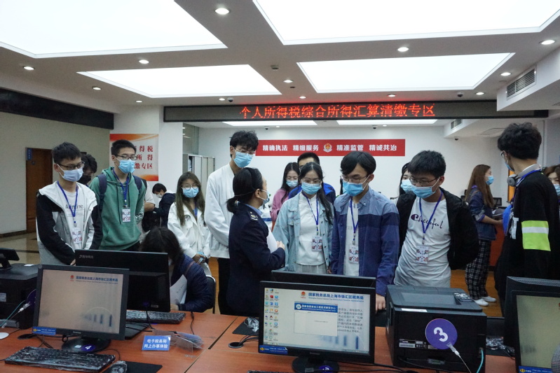 信息学院师生一行首先在徐汇区税务局办税服务厅负责人带领下参观了办税窗口及自助办税体验区,听取关于该局概况信息、窗口功能设置及各项办税缴费服务举措的介绍,并体验了自然人电子税务局相关功能,切实感受信息化办税的便捷高效。