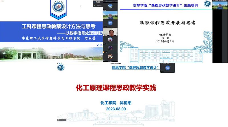 为充分发挥课堂教学主渠道在高校思想政治工作中的作用,构建“三位一体”课程体系,促使各类课程同向而行,形成协同效应,实现全员全过程全方位育人,信息科学与工程学院于2023年8月9日在线上举行了“课程思政教学设计”专题培训会。本次培训会邀请了教务处副处长万永菁、物理学院副院长张孟、化工学院教学名师吴艳阳就课程思政设计及实施进行经验分享。培训会由信息学院副院长谭帅主持,学院的各系主任、各教研室主任、各专业任课老师参加此次会议。